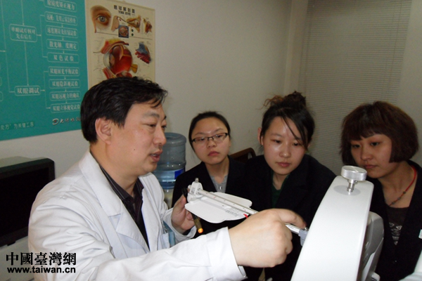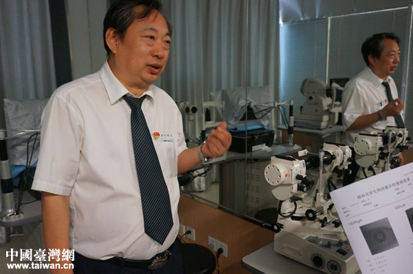 秦英瑞在驗光室里解說設(shè)備功能。(中國臺灣網(wǎng) 雍紫薇 攝)