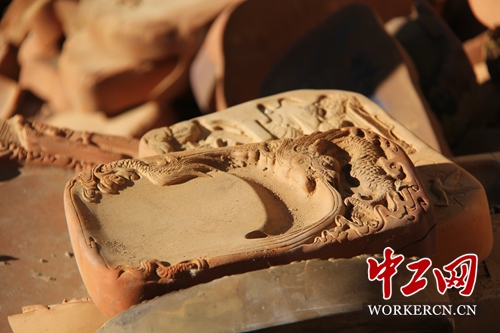 絳州澄泥硯制作工藝復(fù)雜,要?dú)v經(jīng)采泥、過濾、沉淀、制坯、陰干、雕刻、焙燒、拋光等幾十道工序,每道工序都容不得絲毫閃失。其中涉及的繪畫、雕刻、篆刻、文學(xué)、書法、物理、化學(xué)知識哪一項(xiàng)都需要從頭學(xué)起,反復(fù)推敲、實(shí)驗(yàn)。相比于其他民間傳統(tǒng)工藝傳承的延續(xù)性以及理論基礎(chǔ),面對各方面都是空白的絳州澄泥硯,這對父子付出的心血可想而知。