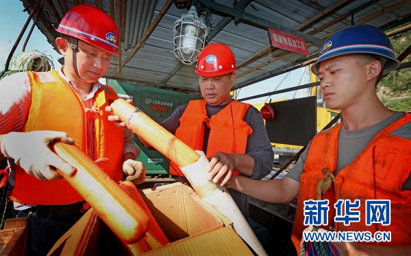 李紅勇(左一)在施工現(xiàn)場(chǎng)檢查裝炸藥(資料照片)。 新華社發(fā)