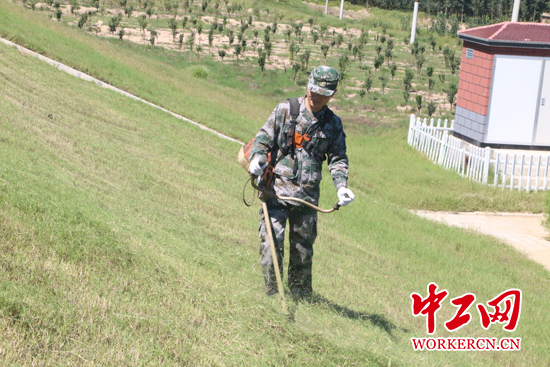 李濤在修剪堤防草皮。中工網(wǎng)記者 朱晶晶 攝
