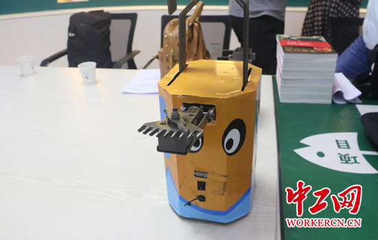 周紅亮和團(tuán)隊研制的小黃人“線路除障精靈”。中工網(wǎng)記者 朱晶晶 攝