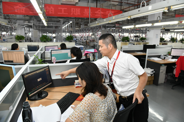 設(shè)計師吳偉和郭軍偉交流設(shè)計要領(lǐng)和工藝要求