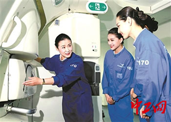 朱文霞(左一)為“小白鷺”進(jìn)行客艙服務(wù)訓(xùn)練。