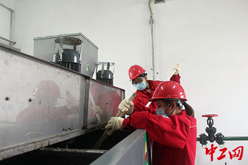 狹窄管線間,趙月嬋和周迎新蜷在其中拆過(guò)濾器、連軟管,動(dòng)作嫻熟,配合默契。一切準(zhǔn)備就緒后,兩個(gè)人在罐頂合力攪拌藥泥,一人在罐底開關(guān)底閥,一人手持軟管排泥進(jìn)桶,大家相互協(xié)作,配合有度。