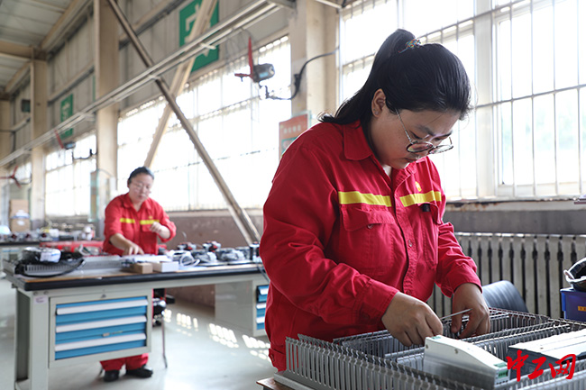 9月2日上午,冀東油田機械公司女子裝配班班組長單鑫正帶領班組成員有條不紊地開展抽油機配電柜的裝配工作。這是機械公司唯一一個只有女工組成的生產型班組。甩線、分線、穿線號、剝線、壓線鼻……她們游刃有余地重復著一系列規(guī)定動作。