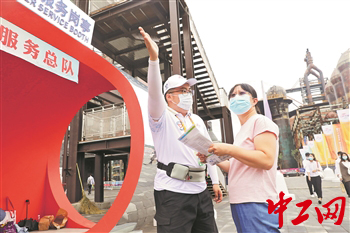 9月5日,北京首鋼園內(nèi),張孟巖(圖左)正在為觀眾做引導(dǎo)。1998年出生的張孟巖是首鋼京唐公司的一名磨輥工。今年8月份,有過志愿服務(wù)經(jīng)驗(yàn)的他被抽調(diào)至北京首鋼園成為了一名服貿(mào)會(huì)志愿者。對(duì)于他來說,這次在首鋼園做志愿者感覺像回家,在這兒經(jīng)常能碰到首鋼的老職工向他詢問服貿(mào)會(huì)的相關(guān)情況以及新廠區(qū)的發(fā)展?fàn)顩r。張孟巖說:“作為首鋼職工能在首鋼園做志愿者,內(nèi)心有一種驕傲和自豪感?!惫と巳?qǐng)?bào)-中工網(wǎng)記者 王偉偉 攝