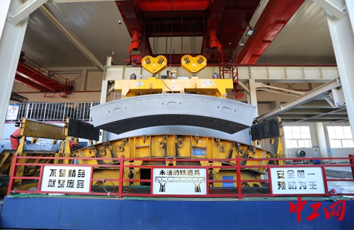 真空吸盤從模具中吊起管片運送至翻轉(zhuǎn)機上大約需要3分鐘,為確保萬無一失,他們在通道下方設置了一層鋼模隔板,為安全生產(chǎn)上了“雙保險”。