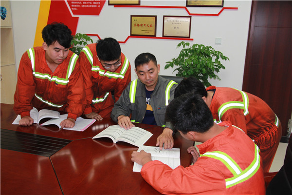 王慶(中)與同事學(xué)習(xí)車輛理論知識