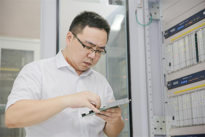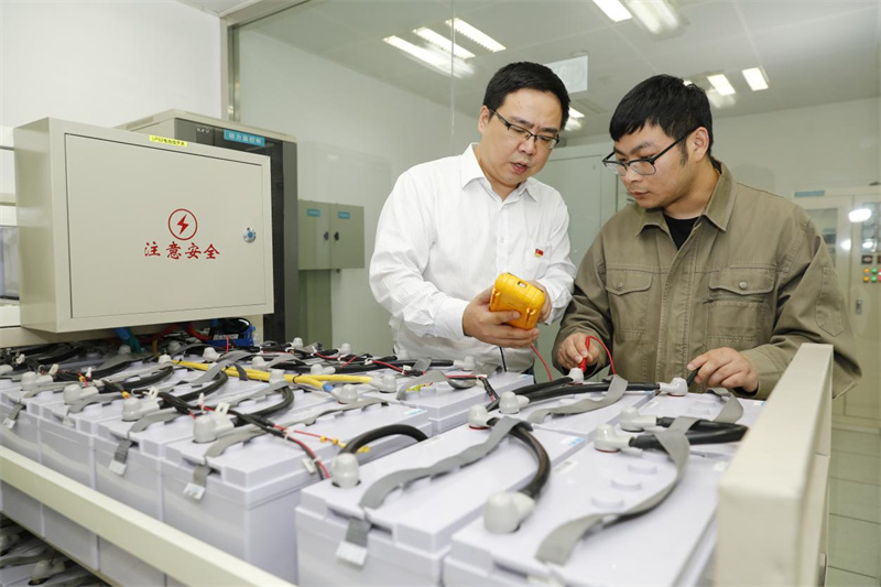 張霽明與同事一起在電源機(jī)房檢測(cè)電源。新華網(wǎng)發(fā) 鄭之超 攝