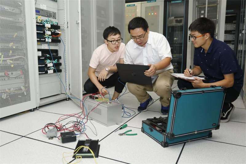 張霽明與團(tuán)隊(duì)一起測(cè)試5G智能檢修機(jī)器人“哪吒”。新華網(wǎng)發(fā) 鄭之超 攝