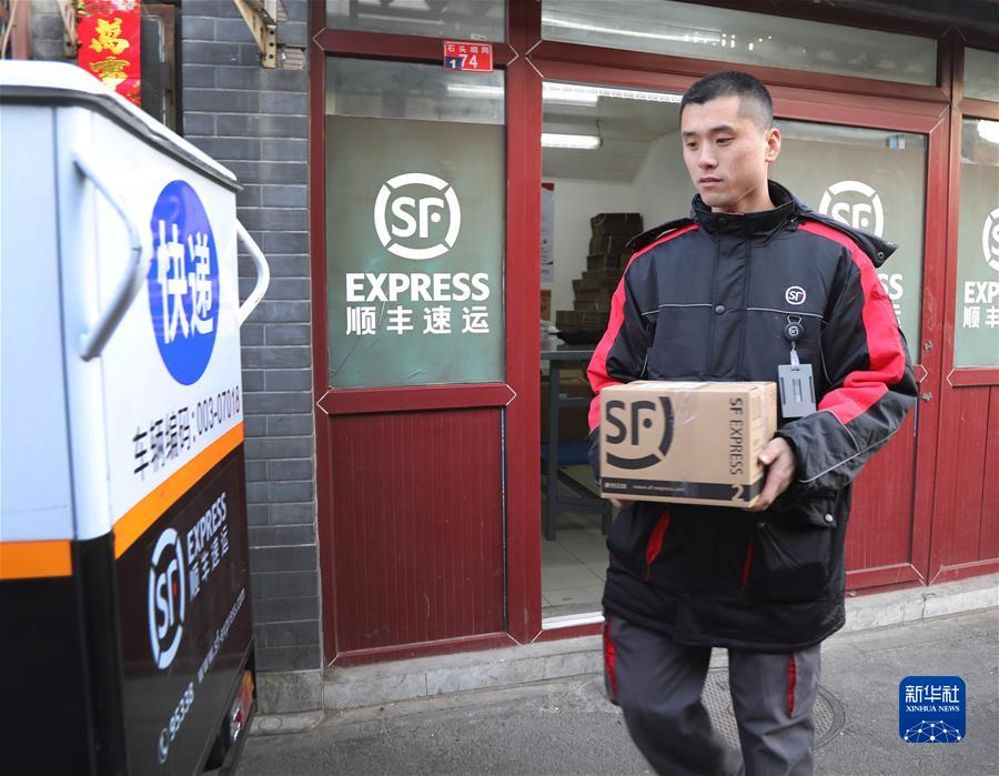 北京前門石頭胡同快遞站點(diǎn)“快遞小哥”劉闊在整理包裹(2019年2月1日攝)。新華社記者 李德欣 攝