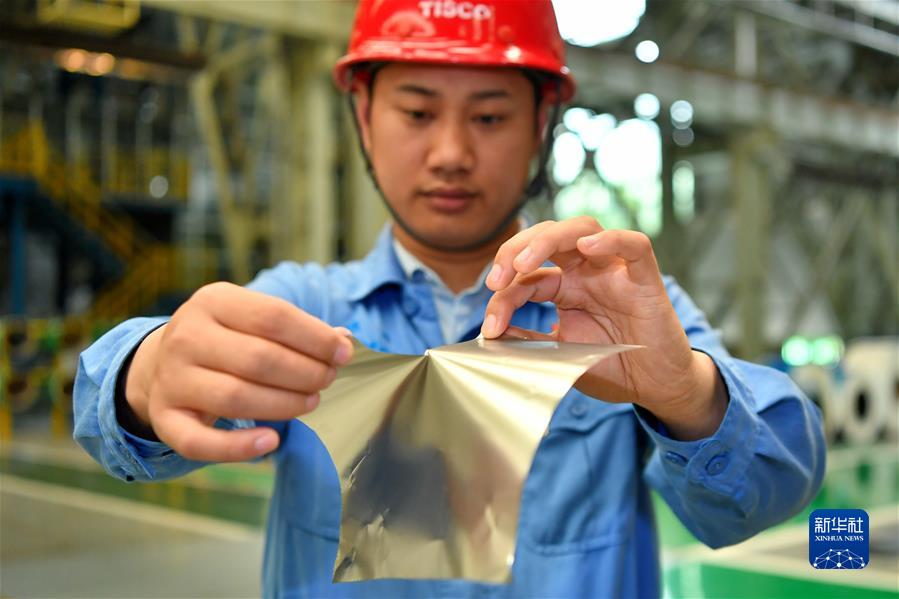 在位于山西的太鋼集團(tuán),員工在展示用手撕開0.02毫米厚的超薄帶狀不銹鋼(2019年5月24日攝)。新華社記者 曹陽 攝