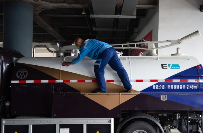 開著現(xiàn)代化的電動(dòng)抽糞車