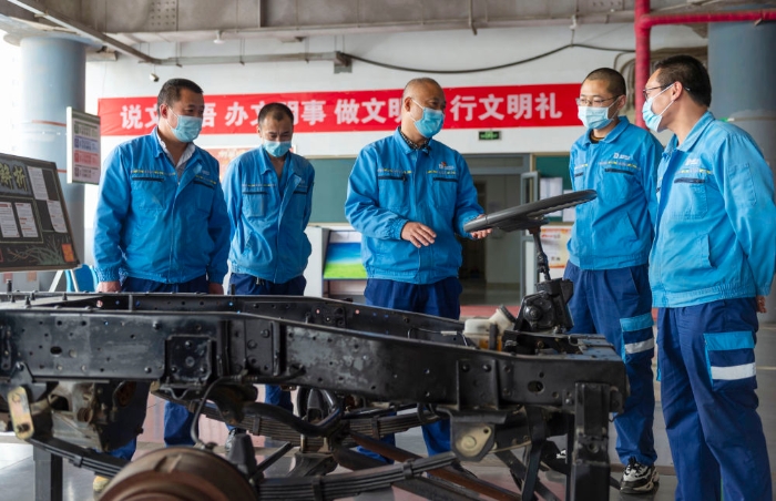 ? ? ? ? ?4月21日,在北京環(huán)衛(wèi)集團(tuán),孫志寶(中)給同事們講解汽車結(jié)構(gòu)。