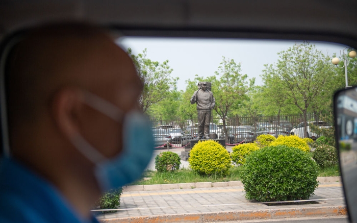 4月25日,孫志寶駕駛抽糞車經(jīng)過北京環(huán)衛(wèi)集團(tuán)外的時(shí)傳祥雕塑。