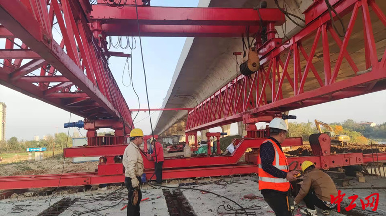 中建二局土木工程集團(tuán)有限公司武漢黃陂項(xiàng)目部通過(guò)改變卷?yè)P(yáng)機(jī)和吊梁扁擔(dān)的整體連接方式,把卷?yè)P(yáng)機(jī)固定在起吊天車(chē)最外側(cè),通過(guò)4根承重60T的鋼絲繩把吊梁扁擔(dān)與起吊天車(chē)連接在一起。在不改變架橋機(jī)受力方式的前提下,實(shí)現(xiàn)梁片橫向自由移動(dòng),極大提高了預(yù)制箱梁架設(shè)速度,把原本112天的工期縮短至32天。(中建二局土木工程集團(tuán)有限公司 黃燦)