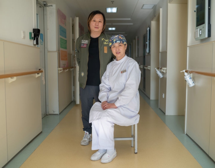 ↑張淑萍與1984年她剛上班時(shí)候接生的“寶寶”柳應(yīng)泉合影留念。柳應(yīng)泉長大后來到醫(yī)院的后勤部門工作,他稱張淑萍為“媽媽”(5月9日攝)。