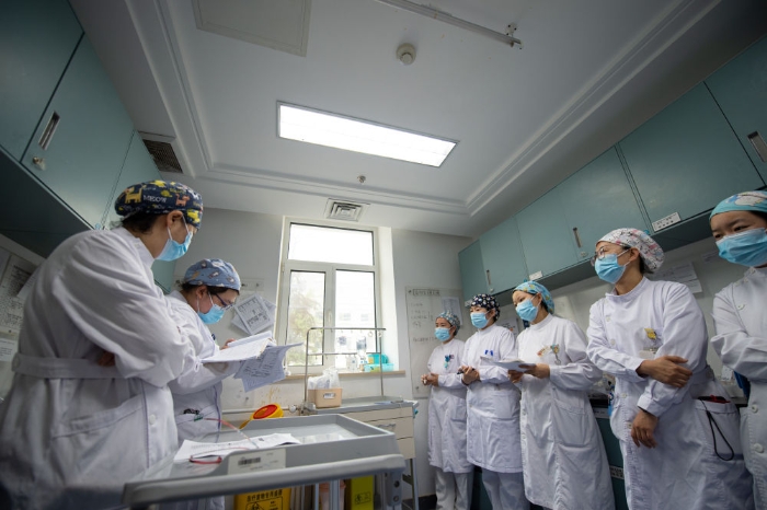 ↑清晨,張淑萍(左一)帶領(lǐng)白夜班護(hù)士交接班(5月10日攝)。