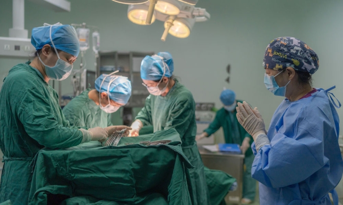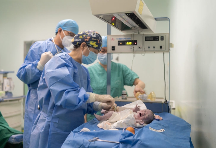 ↑張淑萍(右一)在手術(shù)室內(nèi)準(zhǔn)備迎接新生兒(5月9日攝)。