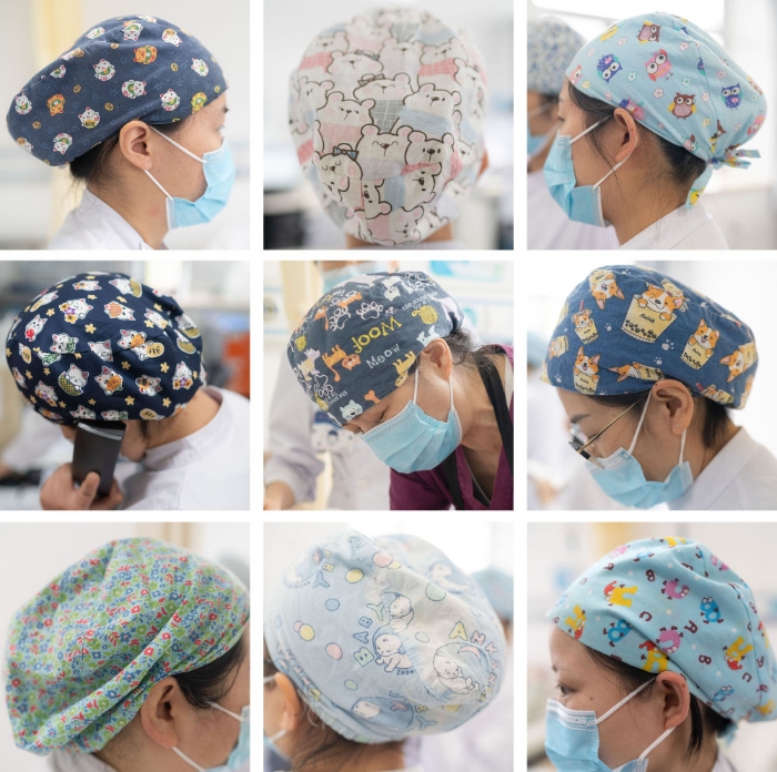 ↑這張拼版照片顯示的是張淑萍(中)與同事戴著各式卡通造型的帽子(5月9日攝)。這種帽子有助于緩解孕婦與患者在病房內(nèi)的情緒。