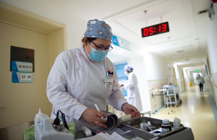 ↑凌晨,張淑萍的同事梁元整理給病人測(cè)量生命體征所需的設(shè)備(5月10日攝)。