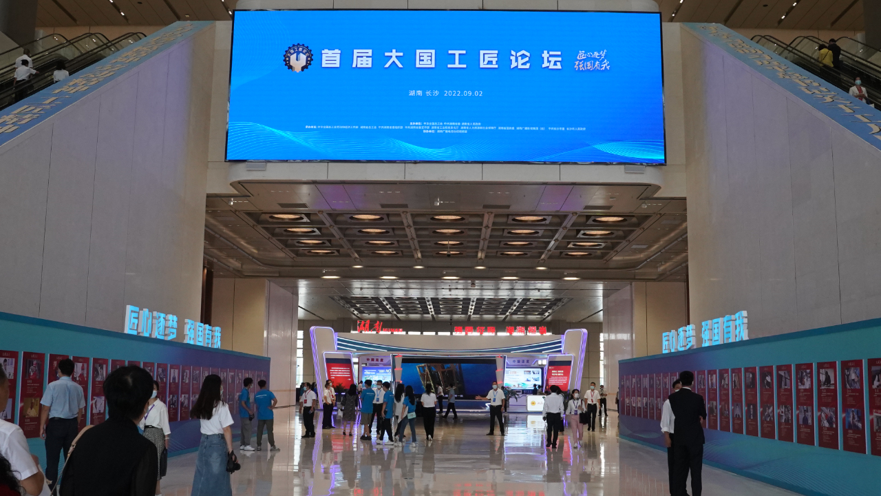 9月2日,首屆大國(guó)工匠論壇在長(zhǎng)沙隆重舉行。圖為開(kāi)幕式現(xiàn)場(chǎng)。(工人日?qǐng)?bào)客戶端記者 方大豐 車輝 王鑫 郝赫 雷宇翔 攝影 竇菲濤)