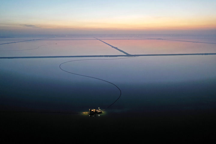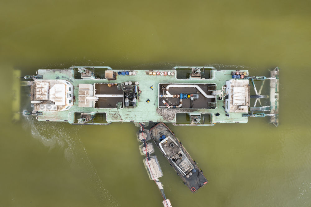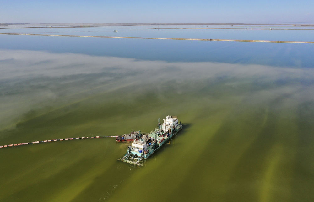 水采船在察爾汗鹽湖中作業(yè)(2月2日攝,無人機照片)。