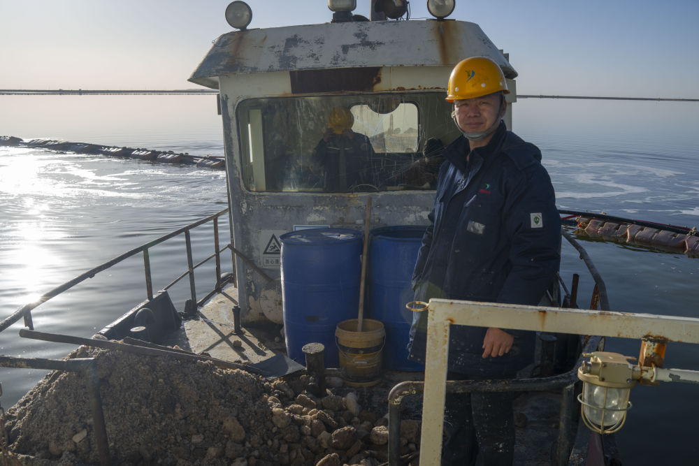 2月2日,賀連福乘坐工作船(下)到達水采船(上)。水采船在劇毒的鹵水鹽田中作業(yè),工作人員每天上下水采船都要通過工作船接駁。