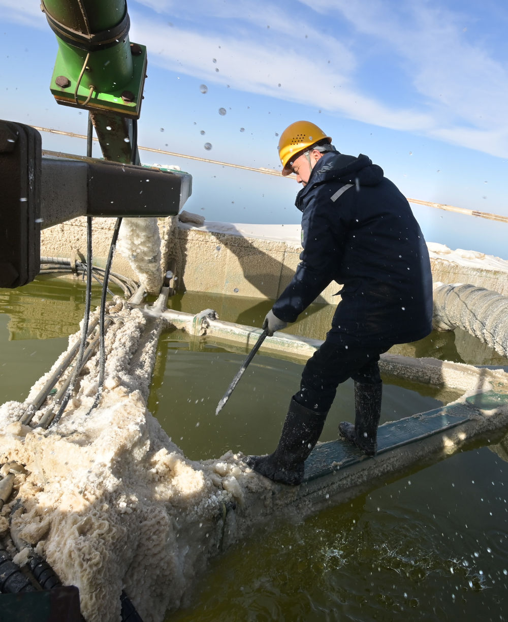 2月2日,賀連福(右)與同事駕駛工作船運輸鹵水結(jié)晶。