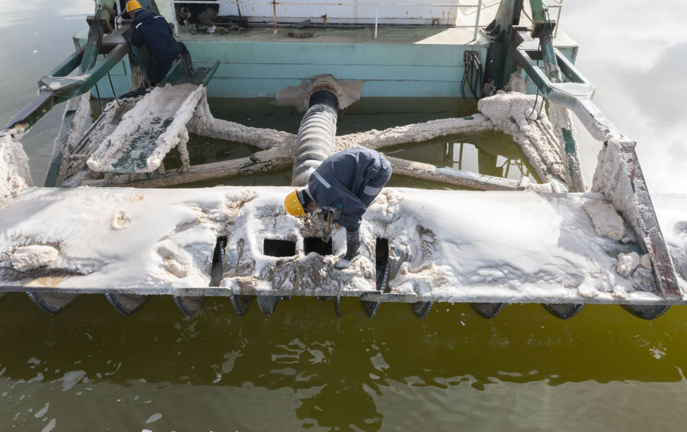 2月2日,賀連福(右)與同事將水采船上清理出的鹽塊轉(zhuǎn)移到工作船上清運走。