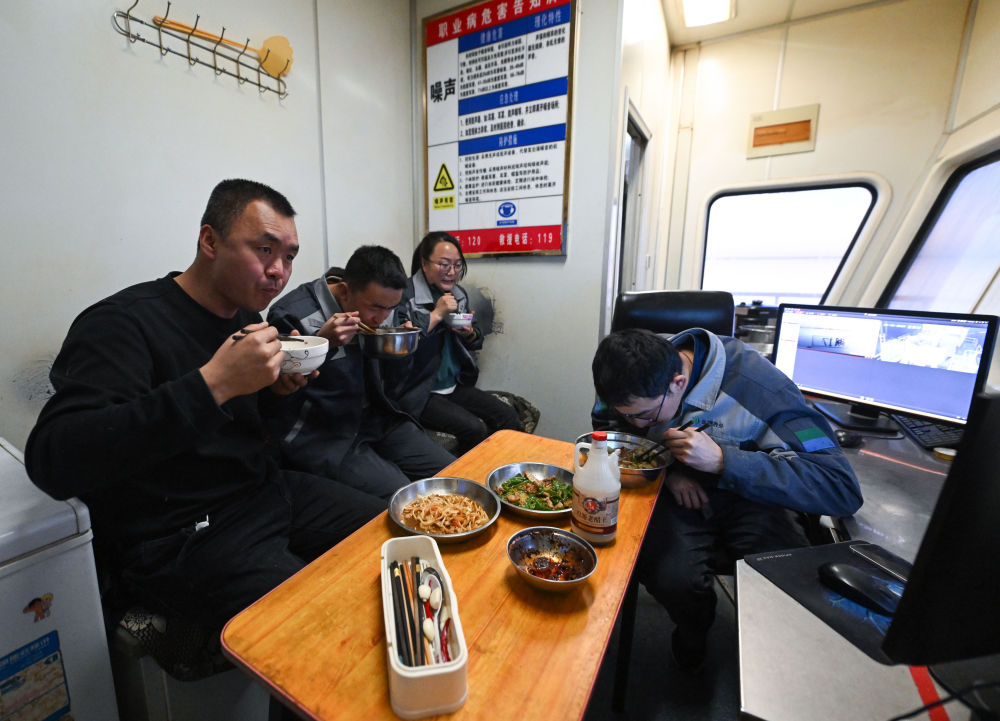 2月2日晚間,賀連福(左一)與同事在水采船上吃晚飯。