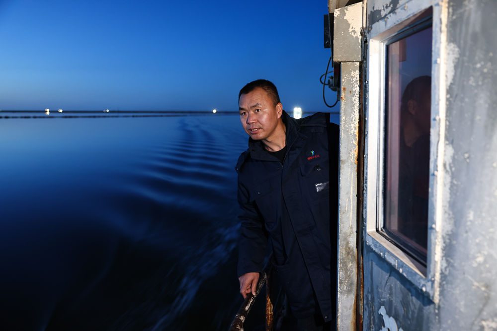 2月2日晚間,賀連福在水采船上巡檢。