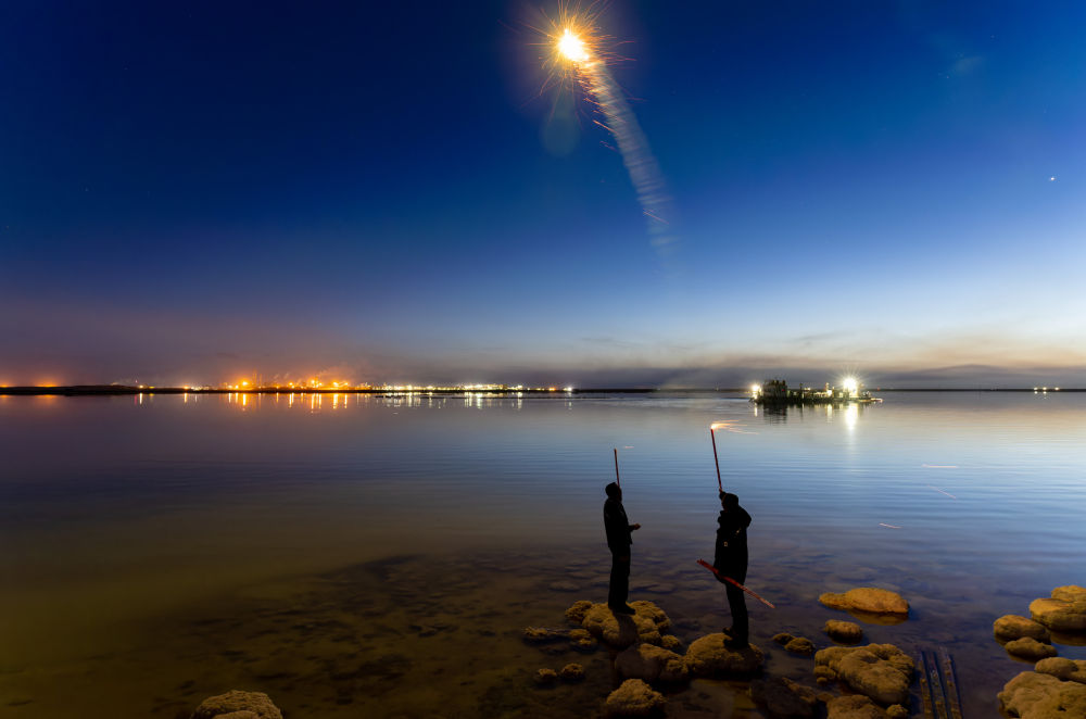 2月2日晚上,賀連福(右)與同事在鹽田岸邊燃放煙花,迎接即將到來的元宵佳節(jié)。