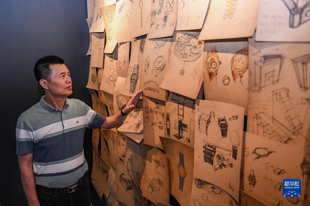 4月25日,在位于深圳的飛亞達(dá)鐘表大廈,劉中華介紹展廳展示的各款手表手稿。新華社記者 毛思倩 攝