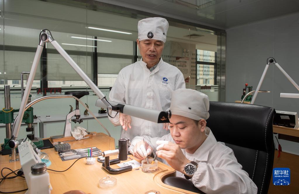 4月25日,在位于深圳的飛亞達(dá)鐘表大廈,劉中華指導(dǎo)徒弟進(jìn)行手表拆卸和清洗。新華社記者 毛思倩 攝