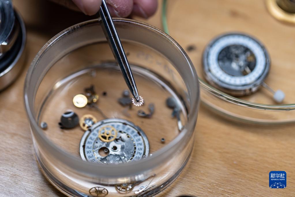 4月25日,在位于深圳的飛亞達(dá)鐘表大廈,劉中華清洗手表拆下的零件。新華社記者 毛思倩 攝