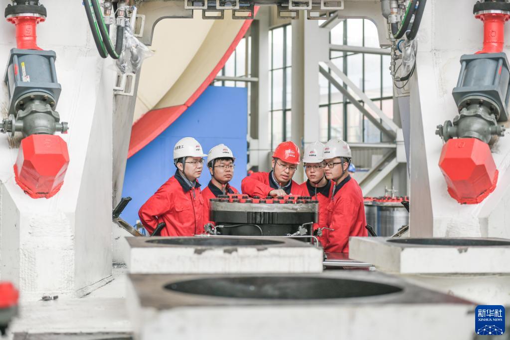 張帥坤(中)和研發(fā)團(tuán)隊在中國鐵建重工集團(tuán)股份有限公司車間進(jìn)行試驗作業(yè)(2021年4月1日攝)。新華社發(fā)