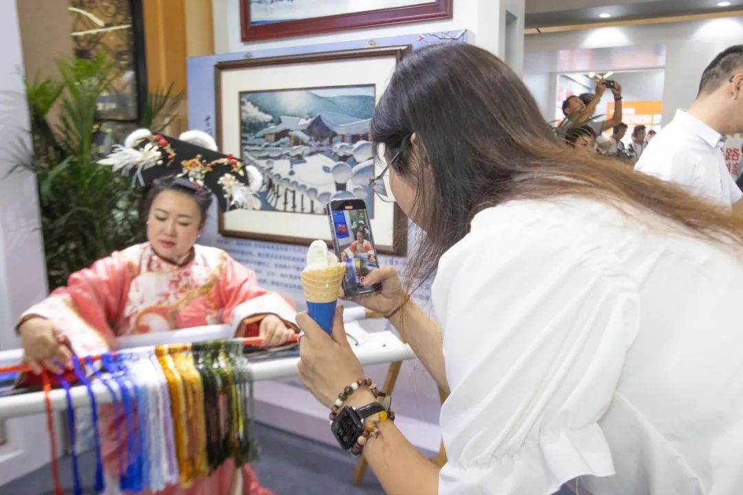 在龍江展會(huì)現(xiàn)場,渤海靺鞨繡、烏魚繡作品如針尖上的芭蕾美輪美奐,赫哲族魚皮畫造型各異極富民族特色,美江木業(yè)帶來的一帶一路北沉香木雕構(gòu)思精巧、精雕細(xì)琢。黑龍江獨(dú)具特色的非遺展示充滿匠心,也展示了龍江創(chuàng)意產(chǎn)業(yè)的蓬勃發(fā)展。在展區(qū)中,完達(dá)山乳業(yè)帶來的冰淇淋奶香濃郁,讓參展觀眾在酷夏感受到了冰雪龍江的宜人清爽。