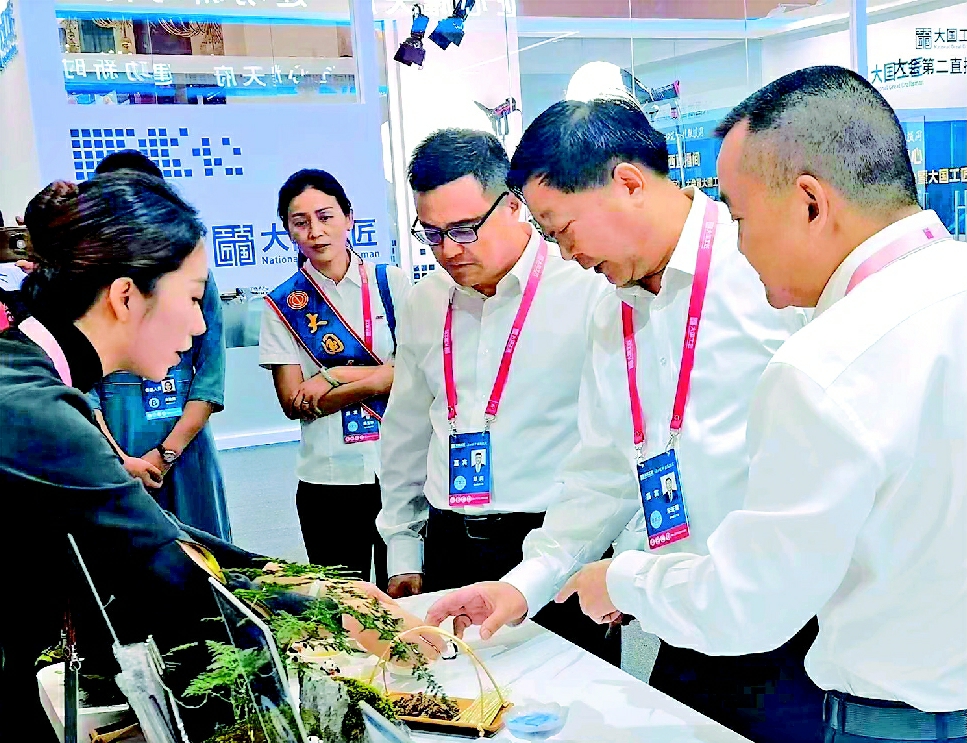 四川省總工會領(lǐng)導(dǎo)在四川展區(qū)觀看職工創(chuàng)新成果。四川省總工會供圖