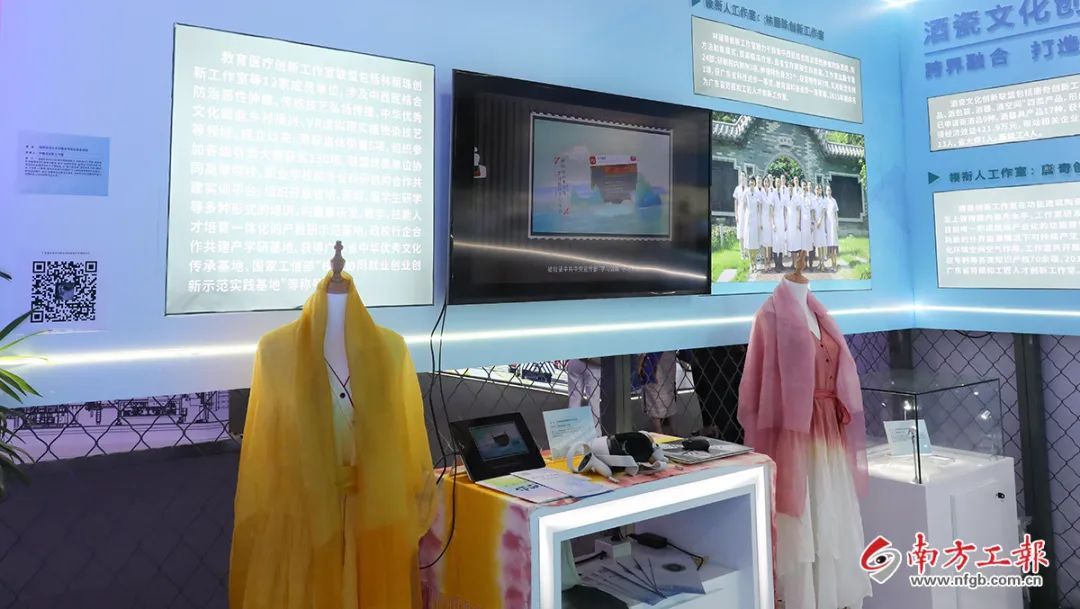 在展區(qū)左側(cè),兩套色彩斑斕的中國風(fēng)服飾讓人眼前一亮?!拔?guī)ьI(lǐng)團(tuán)隊(duì)研制出108種天然染色配方,制作出的植物染多巴胺系列服飾?!苯逃t(yī)療創(chuàng)新工作室聯(lián)盟成員、廣東外語藝術(shù)職業(yè)學(xué)院教授尹春潔站在展位前介紹。
