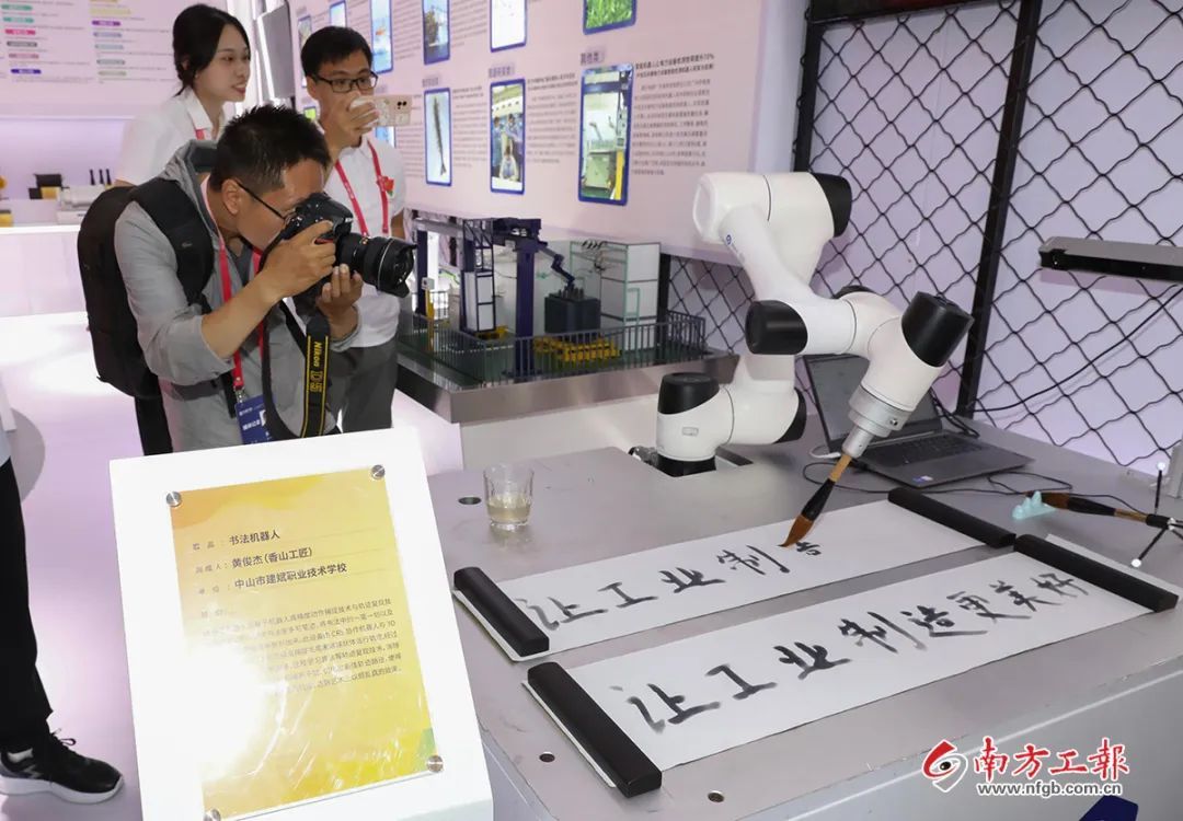 在饒寶蓮的旁邊,香山工匠、中山市建斌職業(yè)技術(shù)學(xué)校教師黃俊杰正在介紹自己帶來的兩款互動(dòng)機(jī)器人。其中書法大師工業(yè)機(jī)器人設(shè)備基于機(jī)器人高精度動(dòng)作捕捉技術(shù)與軌跡復(fù)現(xiàn)技術(shù),可以模仿書法家手寫筆跡,將書法中的一筆一劃以及濃厚的個(gè)人風(fēng)格完美復(fù)刻出來;高速分揀搬運(yùn)工業(yè)機(jī)器人則配合彩色視覺系統(tǒng),可以有效分揀外觀接近但顏色不同的小零件,適用于自動(dòng)化工廠的小零件分揀、整列、裝盒,能夠有效提高分揀效率和穩(wěn)定性,大大降低工人的勞動(dòng)強(qiáng)度。