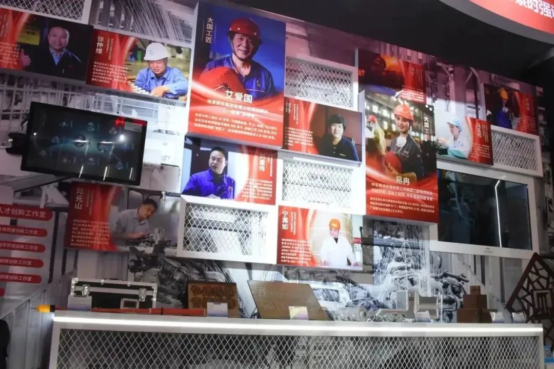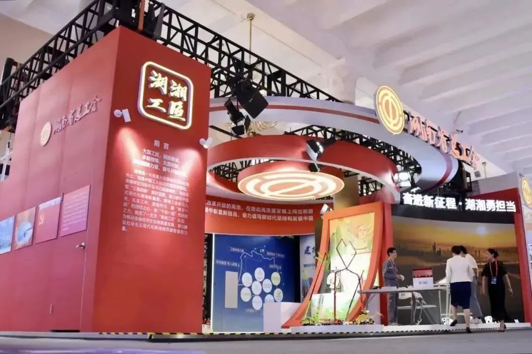 步入以紅色基調(diào)為主的湖南展區(qū),“奮進(jìn)新征程·湖湘勇?lián)?dāng)”十個(gè)大字引入眼簾。前言、鑄魂、聚力、建功四個(gè)部分,以圖文視頻、數(shù)據(jù)矩陣、實(shí)物模型、場(chǎng)景搭建、多媒體融合、打卡裝置等多種表現(xiàn)形式,突出展示大國(guó)工匠、湖湘工匠、創(chuàng)新工作室成果、職工創(chuàng)新成果、工匠工作成果及湖南大國(guó)重器、智能制造等成果。