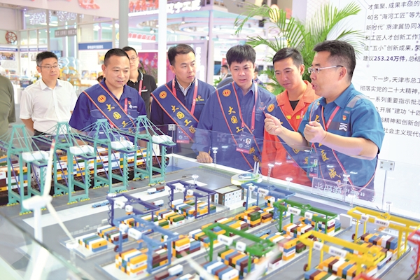 大國工匠們參觀天津展區(qū)的智慧港口綠色港口展臺 韓志忠/攝