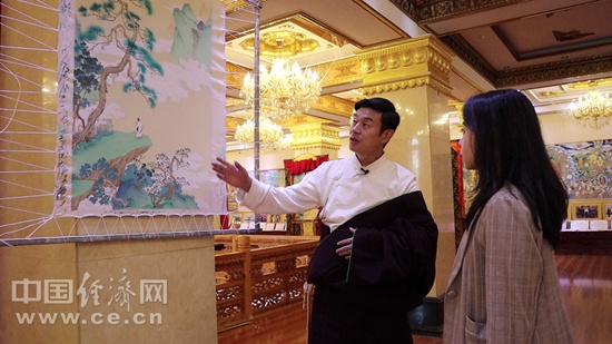 完德尖措講述唐卡與傳統(tǒng)工筆畫(huà)的結(jié)合創(chuàng)新作品。中國(guó)經(jīng)濟(jì)網(wǎng)記者 李凡攝。