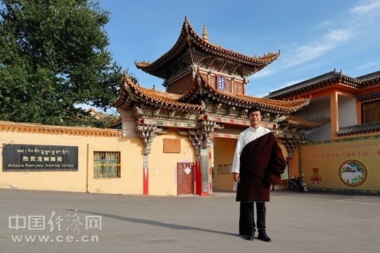 完德尖措站在熱貢龍樹(shù)畫(huà)苑前。中國(guó)經(jīng)濟(jì)網(wǎng)記者 李凡攝。