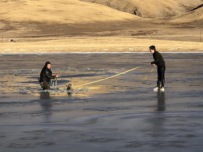 2019年11月,加羊多杰在和2名同事一起巡護時,遠遠看見結(jié)了冰的湖面上有一抹黑影。因為冰面斷裂,一匹狼被困在了湖中心?;貞浧疬@段經(jīng)歷,加羊多杰仍然很緊張,“當時的氣溫是零下十幾度,我們可用的工具只有繩子,如果不能在天黑前完成救援,狼就會被凍死?!?/p>