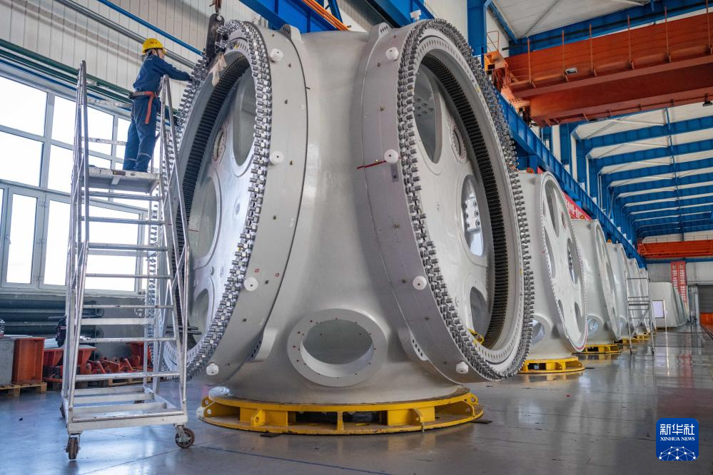 4月28日,在位于黑龍江省齊齊哈爾市的中國一重集團有限公司,工作人員在風電設備裝配車間內(nèi)加工風電輪轂。新華社記者 謝劍飛 攝