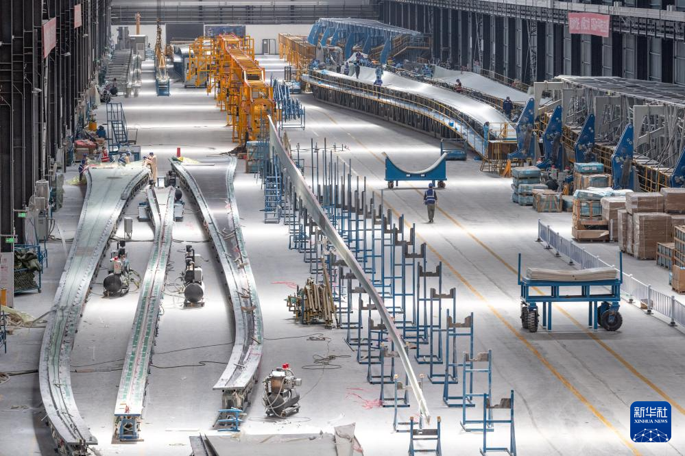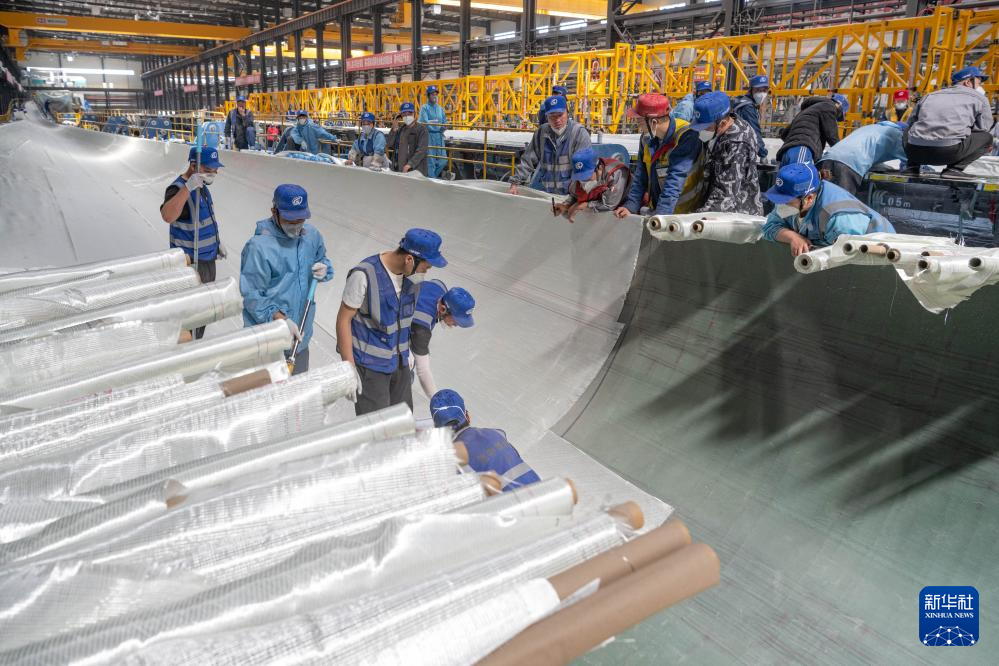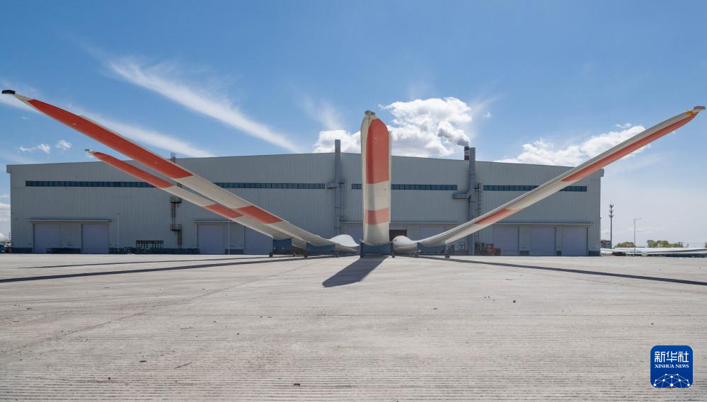 4月28日,在一重龍申(齊齊哈爾)復合材料有限公司,工作人員在廠區(qū)進行風電葉片生產(chǎn)作業(yè)。新華社記者 謝劍飛 攝