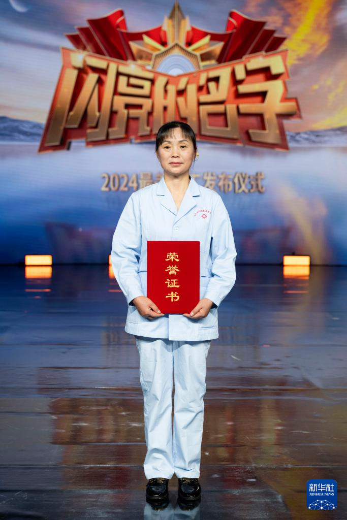 四川省巴中市通江縣大椿養(yǎng)老康復(fù)中心養(yǎng)老護理員蒲玉在“最美職工”發(fā)布儀式上(4月24日攝)。新華社記者 才揚 攝