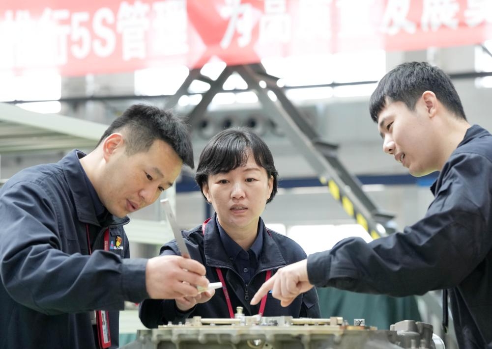 王璐璐(中)與同事一起研究工作(4月22日拍攝)。新華社記者李鋼 攝